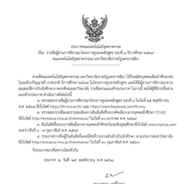 ประกาศรายชื่อผู้ผ่านการพิจารณาโครงการคูปองหลักสูตร รอบที่ ๑ ปีการศึกษา ๒๕๖๙ คณะเทคโนโลยีอุตสาหกรรม มหาวิทยาลัยราชภัฏนครราชสีมา