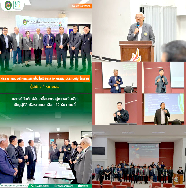 วันนี้ (9 ธันวาคม 2568) คณะกรรมการสรรหาคณบดีคณะเทคโนโลยีอุตสาหกรรม มหาวิทยาลัยราชภัฏนครราชสีมา ได้จัดการนำเสนอวิสัยทัศน์และแนวทางการบริหารคณะเทคโนโลยีอุตสาหกรรมแก่ประชาคมของมหาวิทยาลัย ณ ห้องประชุมคณะเทคโนโลยีอุตสาหกรรม โดยมี นายสุวัฒน์ จึงวิวัฒนาภรณ์ ประธานคณะกรรมการสรรหาคณบดีคณะเทคโนโลยีอุตสาหกรรม กล่าวต้อนรับ และแจ้งหลักเกณฑ์การนำเสนอวิสัยทัศน์ จากนั้นเป็นการนำเสนอวิสัยทัศน์ของผู้สมัครทั้ง 4 หมายเลข ได้แก่