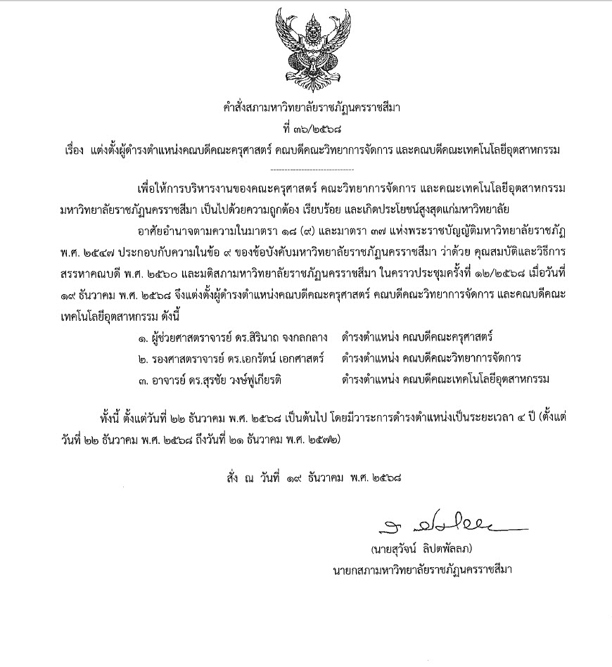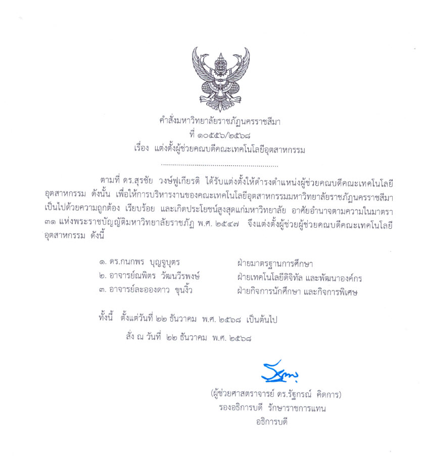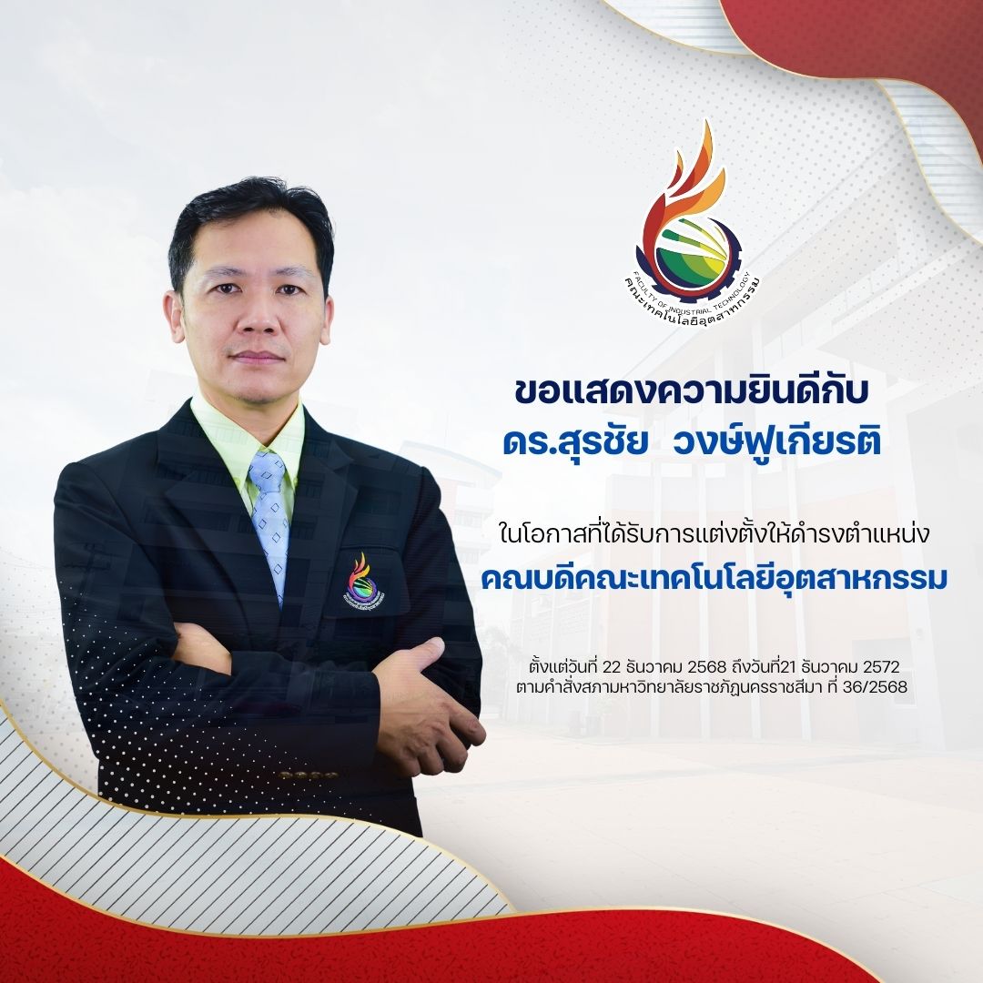 ขอแสดงความยินดีกับ ดร. สุรชัย วงษ์ฟูเกียรติ ในโอกาสที่ได้รับการแต่งตั้งให้ดำรงตำแหน่ง คณบดีคณะเทคโนโลยีอุตสาหกรรม มหาวิทยาลัยราชภัฏนครราชสีมา ตั้งแต่วันที่ 22 ธันวาคม 2568 โดยมีวาระการดำรงตำแหน่งเป็นระยะเวลา 4 ปี ถึงวันที่ 21 ธันวาคม 2572 ตามคำสั่งสภามหาวิทยาลัยราชภัฏนครราชสีมา ที่ 36/2568