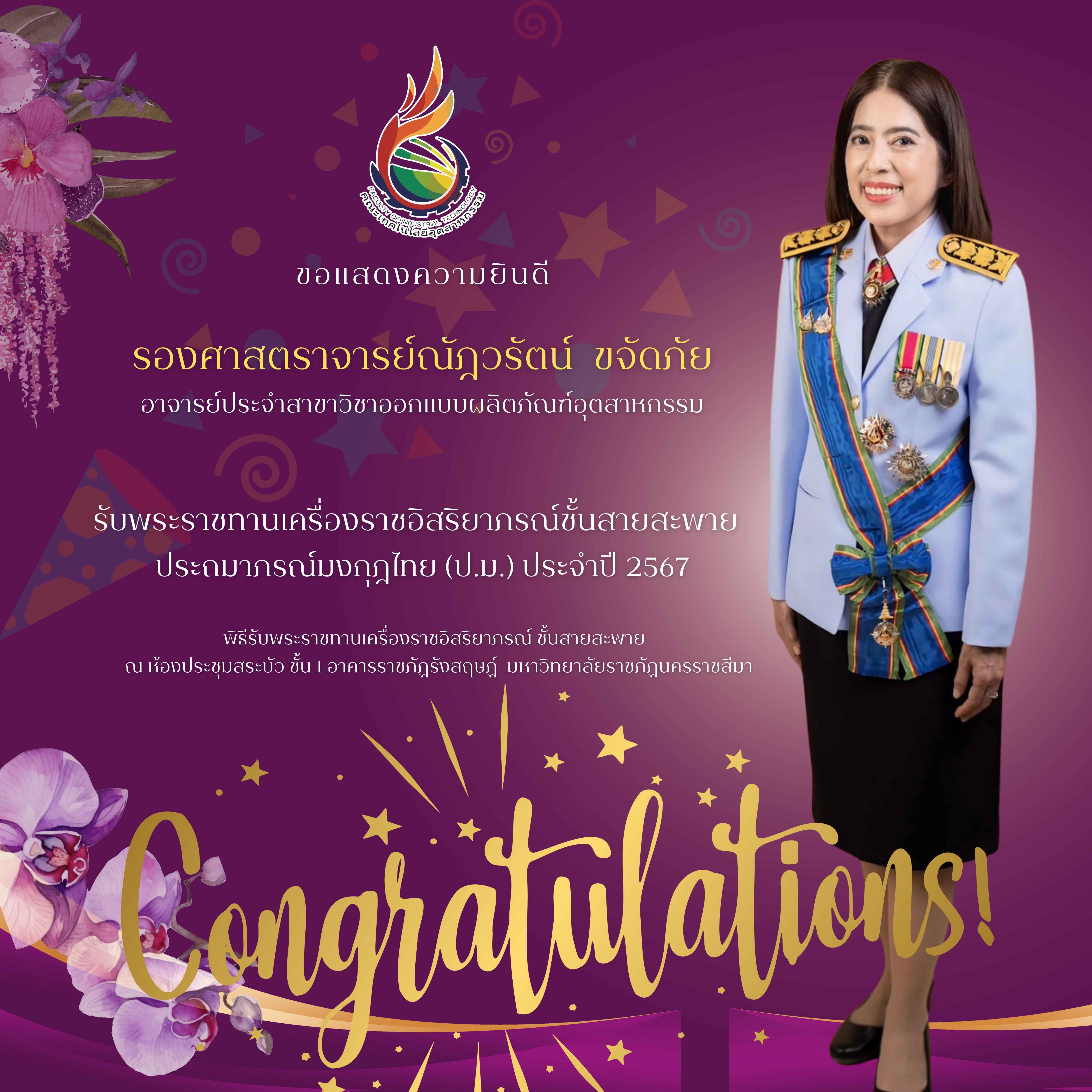 ขอแสดงความยินดีกับ รองศาสตราจารย์ณัฎวรัตน์ ขจัดภัย อาจารย์ประจำสาขาวิชาออกแบบผลิตภัณฑ์อุตสาหกรรม รับพระราชทานเครื่องราชอิสริยาภรณ์ ชั้นสายสะพาย ประจำปี 2567 ในโอกาสพระบาทสมเด็จพระเจ้าอยู่หัว ทรงพระกรุณาโปรดเกล้าโปรดกระหม่อมพระราชทานเครื่องราชอิสริยาภรณ์ ชั้นตราประถมาภรณ์มงกุฎไทย ชั้นสายสะพาย เพื่อเชิดชูเกียรติให้กับข้าราชการในสังกัด มหาวิทยาลัยราชภัฏนครราชสีมา