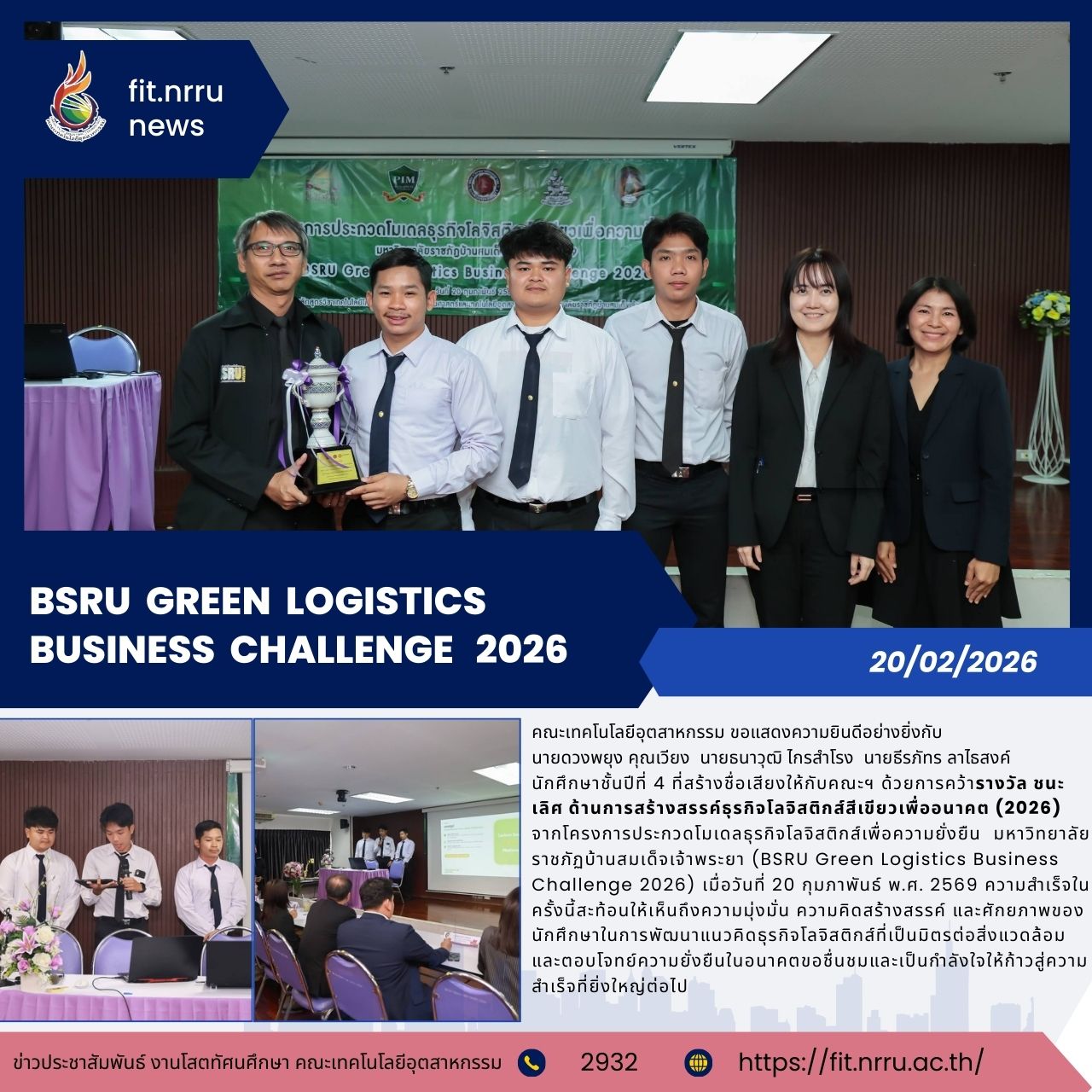 คณะเทคโนโลยีอุตสาหกรรม ขอแสดงความยินดีอย่างยิ่งกับ นายดวงพยุง คุณเวียง นายธนาวุฒิ ไกรสำโรง นายธีรภัทร ลาไธสงค์ นักศึกษาชั้นปีที่ 4 หลักสูตร วศ.บ. สาขาวิชาการจัดการงานวิศวกรรม (ต่อเนื่อง) ที่สร้างชื่อเสียงให้กับคณะฯ ด้วยการคว้ารางวัล ชนะเลิศ ด้านการสร้างสรรค์ธุรกิจโลจิสติกส์สีเขียวเพื่ออนาคต (2026) จากโครงการประกวดโมเดลธุรกิจโลจิสติกส์เพื่อความยั่งยืน มหาวิทยาลัยราชภัฏบ้านสมเด็จเจ้าพระยา (BSRU Green Logistics Business Challenge 2026) เมื่อวันที่ 20 กุมภาพันธ์ พ.ศ. 2569 โดยมี อ.ดร.กนกพร บุญจูบุตร และ อ.ละอองดาว ขุนงิ้ว เป็นผู้ควบคุม ความสำเร็จในครั้งนี้สะท้อนให้เห็นถึงความมุ่งมั่น ความคิดสร้างสรรค์ และศักยภาพของนักศึกษาในการพัฒนาแนวคิดธุรกิจโลจิสติกส์ที่เป็นมิตรต่อสิ่งแวดล้อมและตอบโจทย์ความยั่งยืนในอนาคต ขอชื่นชมและเป็นกำลังใจให้ก้าวสู่ความสำเร็จที่ยิ่งใหญ่ต่อไป