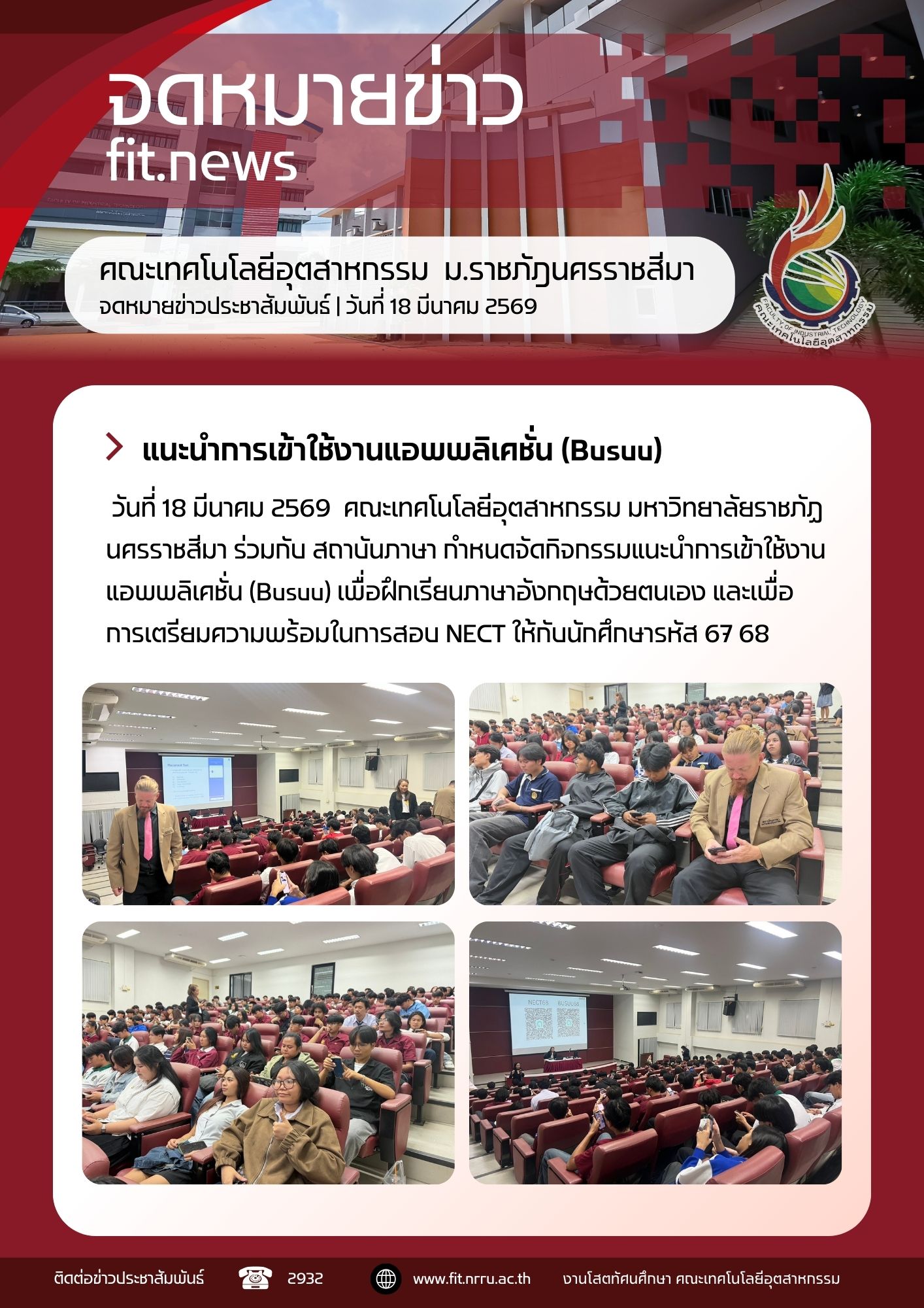 วันที่ 18 มีนาคม 2568 คณะเทคโนโลยีอุตสาหกรรม มหาวิทยาลัยราชภัฏนครราชสีมา ร่วมกับสถาบันภาษา ได้กำหนดจัดกิจกรรมแนะนำการใช้งานแอปพลิเคชัน Busuu เพื่อส่งเสริมให้นักศึกษาได้ฝึกฝนทักษะภาษาอังกฤษด้วยตนเองอย่างมีประสิทธิภาพ
