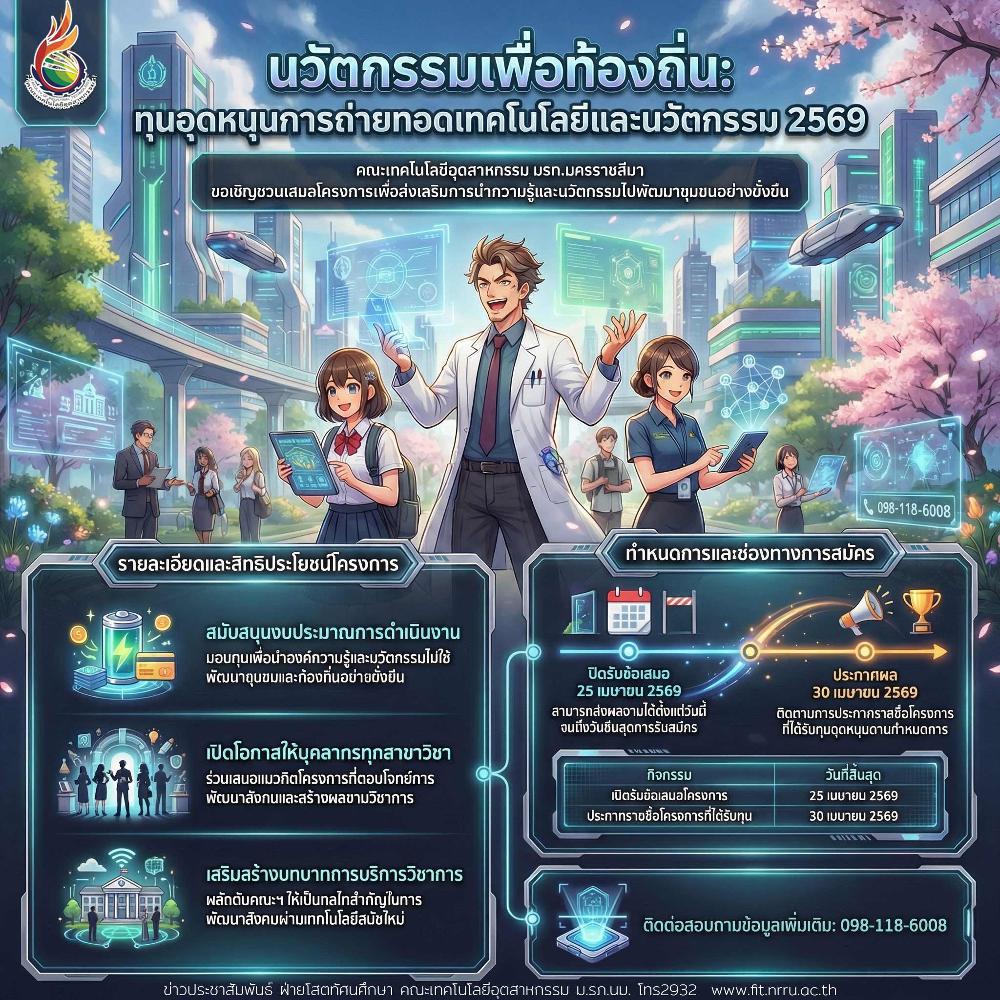 ขอเชิญบุคลากรคณะเทคโนโลยีอุตสาหกรรมร่วมจัดทำข้อเสนอโครงการทุนอุดหนุนการถ่ายทอดเทคโนโลยีและนวัตกรรมเพื่อพัฒนาท้องถิ่น ประจำปีงบประมาณ พ.ศ. 2569
